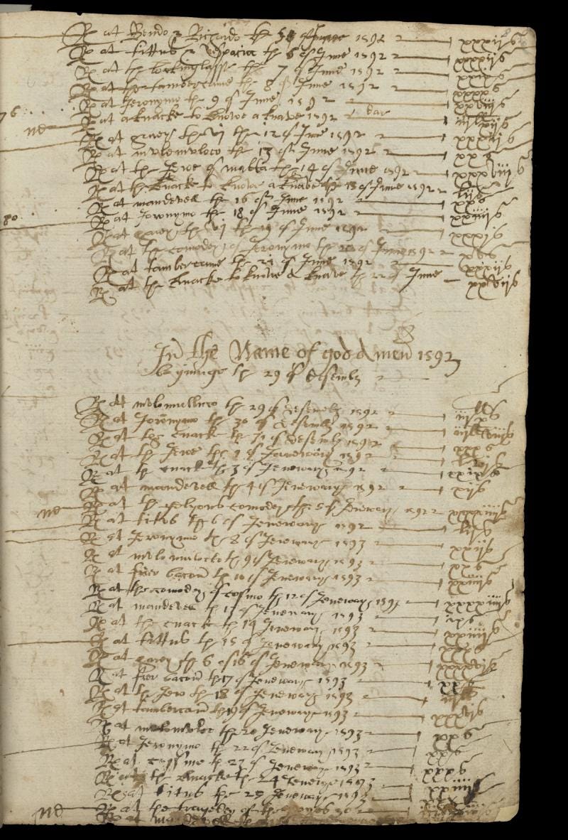 The originals are hard to read, so I referred to the official transcripts as well. But as I worked back and forward around May 30 1593, I was struck by something odd. There was not a single mention in any of the letters of the sudden, scandalous and potentially disastrous death of Christopher Marlowe, the star playwright of the Rose Theatre.
