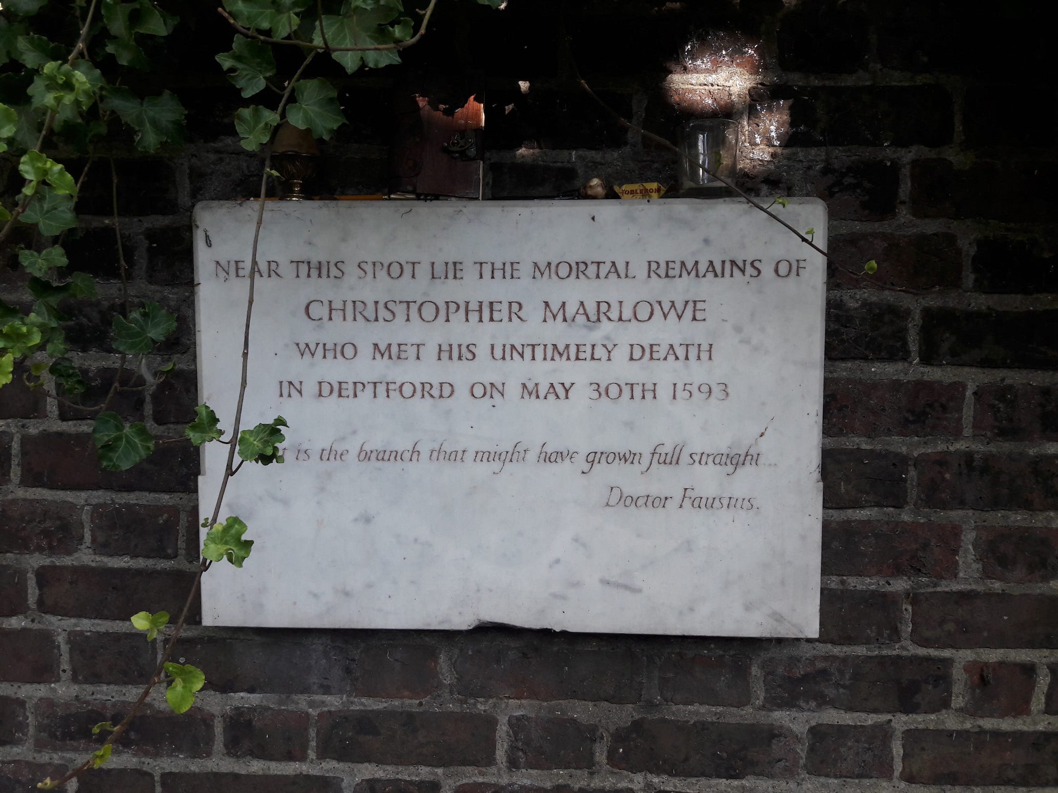 I didn’t find God, but I did find Christopher Marlowe, and with him the subject of my first novel. There’s a plaque in the church yard, which reads: ‘Near this spot lie the mortal remains of Christopher Marlowe, who met his untimely death in Deptford on May 30, 1593. Cut is the branch that might have grown full straight. Doctor Faustus.’